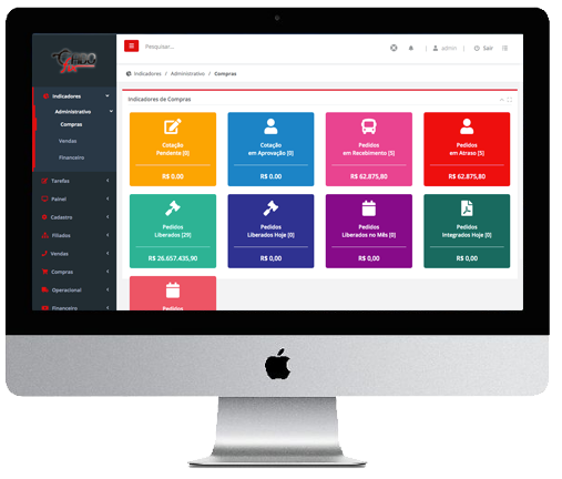 Módulos: Financeiro, Compras, Vendas, Estoque, Produção, CRM e Dashboards.